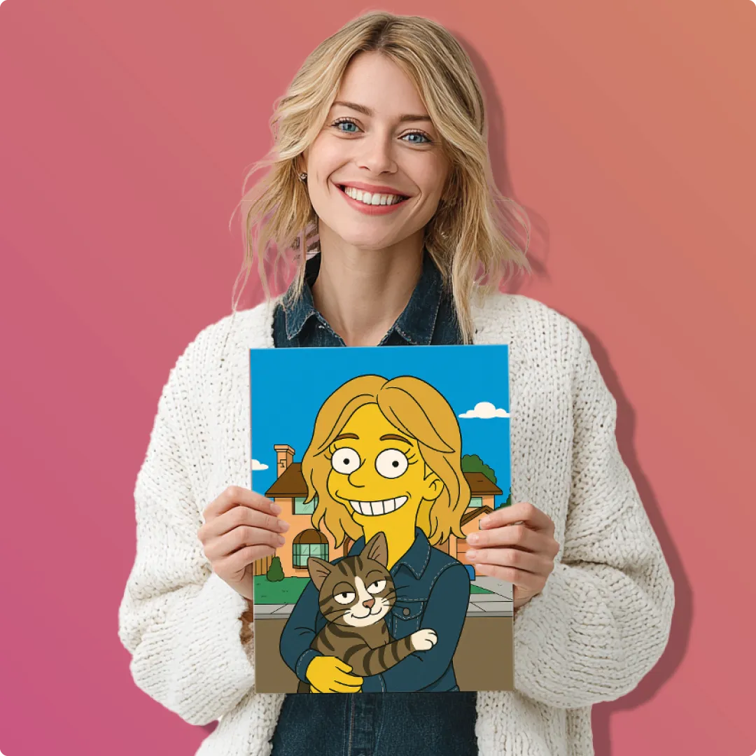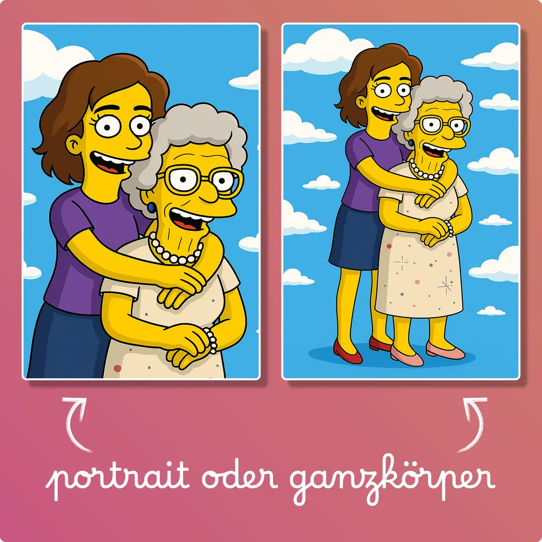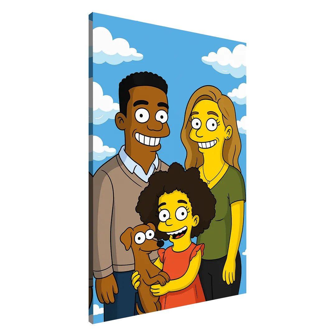 Dein Foto wird in einer Comic Zeichnung im gelben Cartoonstil umgesetzt – Simpsonize me, individuell für dich gestaltet. Als Leinwanddruck wird daraus ein Highlight für dein Zuhause oder ein originelles Geschenk.